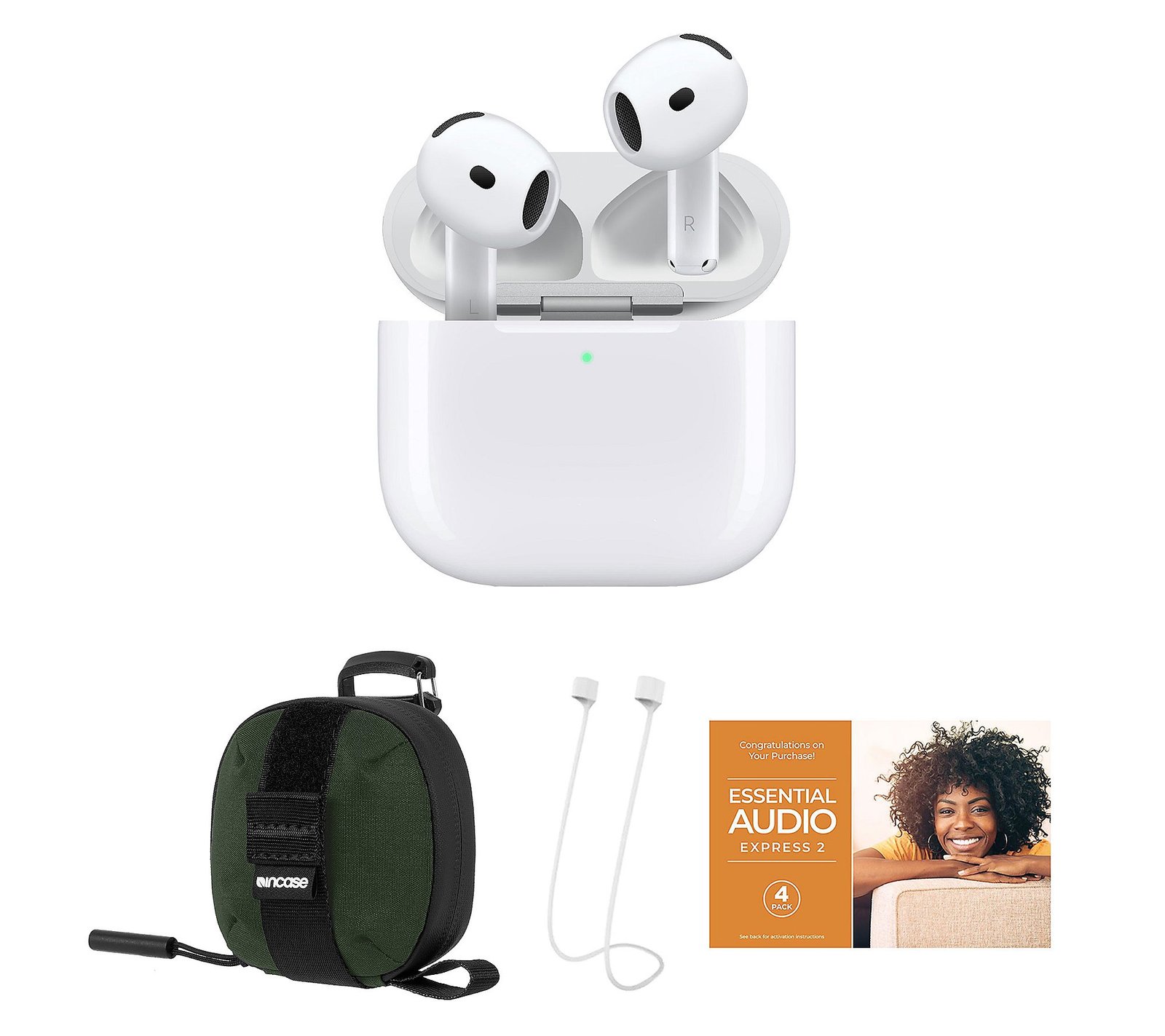 The next evolution of portable sound, the fourth-generation Apple AirPods with Active Noise Cancellation provide a totally transformed audio experience. Personalized spatial audio with dynamic head tracking places sound all around you, creating a three-dimensional listening experience, while adaptive EQ automatically tunes music to your ears. Powered by the H2 headphone chip and redesigned for comfort, the shortened stem with force sensor lets you control playback and calls with just a pinch and the oh-so-simple setup connects instantly to Apple devices (and your favorite personal assistant). And with the Active Noise Cancellation option, embrace the option to block out the world around you when you need to focus. This bundle also comes with useful accessories, including a neck wrap and case. Includes fourth-generation Apple® AirPods® with with Active Noise Cancellation and USB-C charging case; magnetic neck wrap, Incase transfer case, and voucher H2 headphone chip Bluetooth 5.3 wireless technology Custom high-excursion Apple driver Custom high dynamic range amplifier Active Noise Cancellation Adaptive Audio Transparency mode Conversation Awareness Voice Isolation Personalized spatial audio with dynamic head tracking Adaptive EQ Vent system for pressure equalization Dual beamforming microphones; inward-facing microphone Motion- and speech-detecting accelerometer Optical in-ear sensor Force sensor Charges via USB-C port Imported Set a Reminder Save Reminders