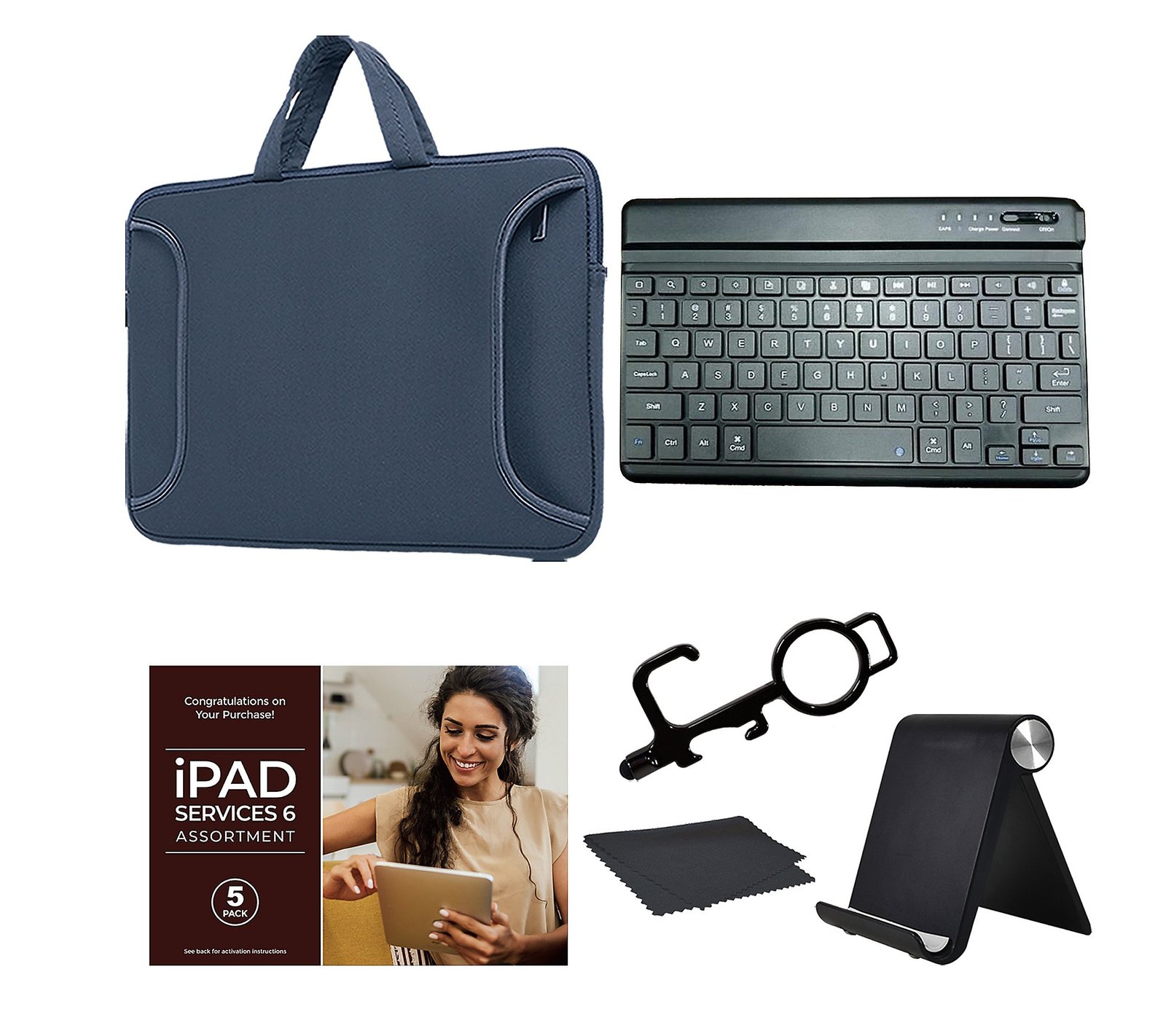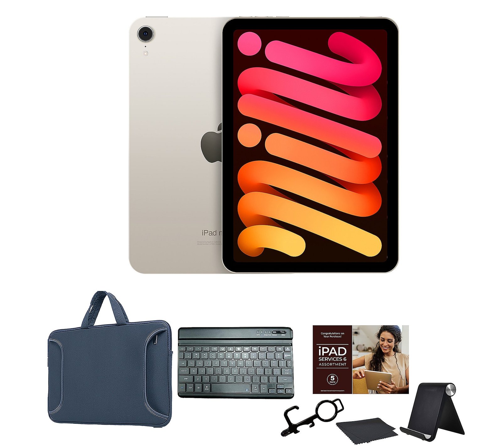 Big screen attitude in an ultraportable design, the Apple iPad mini lets you work, play, create, and study from anywhere with a 8.3″ Liquid Retina display, speedy Wi-Fi 6E, and a stunning 12-megapixel camera system. Updated with a blazing-fast A17 Pro chip and 16-core Neural Engine, this portable powerhouse enables Apple Intelligence to help you express yourself and get things done effortlessly. This bundle comes with many handy accessories, including a Bluetooth keyboard, tablet stand, and carry case to help you get started. Includes Apple® iPad mini® 7 tablet with USB-C charging cable and 20W USB-C power adapter; Bluetooth keyboard, carry case, tablet stand, 3-in-1 stylus, and microfiber cloth iPadOS 18 operating system A17 Pro chip with 16-core Neural Engine, 6-core CPU, 5-core GPU 8.3″ diagonal LED-backlit multi-touch Liquid Retina display with 2266×1488 resolution, True Tone, fingerprint-resistant coating 128GB solid-state drive 802.11ax Wi-Fi 6E with MIMO Bluetooth 5.3 wireless technology Apple Intelligence 12-megapixel Wide camera with autofocus, panorama, 5X digital zoom, True Tone flash, Smart HDR 4, 4K and 1080p HD video, slo-mo video at 120fps, auto image stabilization 12-megapixel Ultra Wide front camera with 1080p HD video recording Landscape stereo speakers Touch ID Apple Pay Supports Apple Pencil Pro and USB-C, not included USB-C port Built-in lithium-polymer battery Measures approximately 7.69″ x 5.3″ x 0.25″; weighs 0.65 lb UL listed Imported Set a Reminder Save Reminders