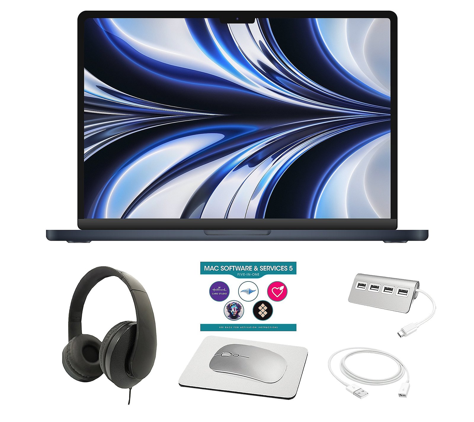 Supercharged by the mighty M2 chip, the 13.6″ Apple® MacBook Air® boasts incredible performance and vibrant imagery with its Liquid Retina display. Perfect for days packed with creativity, this marvel delivers an immersive experience whether you’re streaming your favorite shows or working on a presentation. The FaceTime HD camera lets you look sharp (and sound great!) so your loved ones can see and hear you clearly when you can’t be there in person. And everything comes together in a lightweight design, so you can take your portable powerhouse anywhere you need to be. Includes MacBook Air 13-inch with USB-C to MagSafe 3 cable and USB-C power adapter; headphones, mouse pad, wireless mouse, USB extension cable, and four-port USB hub macOS operating system M2 chip with 8-core CPU; 8-core GPU; 16-core Neural Engine 13.6″ diagonal Liquid Retina display with 2560×1664 resolution and IPS technology, True Tone technology 16GB RAM 256GB solid-state drive 802.11ax Wi-Fi 6; 802.11a/b/g/n/ac compatible Bluetooth 5.3 wireless technology Four-speaker sound system with Spatial Audio 1080p FaceTime HD camera Three-mic array with directional beamforming Backlit Magic Keyboard with Touch ID Force Touch trackpad Built-in lithium-ion battery MagSafe 3 charging port Two Thunderbolt/USB 4 ports 3.5 mm headphone jack Measures 11.97 x 8.46 x 0.44 inches; weighs 2.7 lbs UL listed Imported Set a Reminder Save Reminders