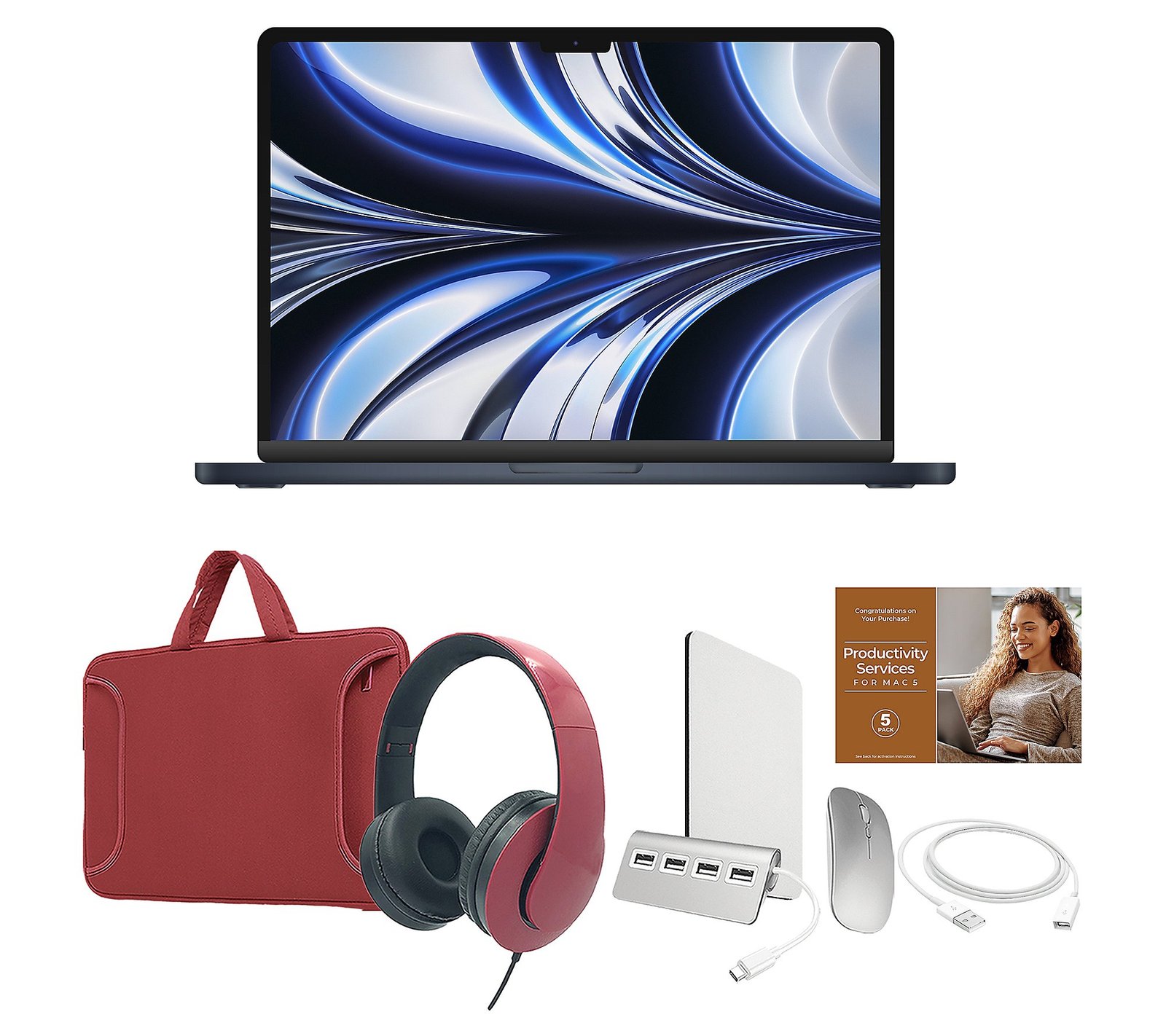 Supercharged by the speedy and fluid M3 chip, the Apple® MacBook Air® is ready for anything and everything, allowing you the space to create, work, and entertain all in one place (no matter where you need to be!). Videos and photos pop with rich contrast and sharp detail on the breathtaking Liquid Retina display, while the immersive sound system takes movies and music to the next level. Includes MacBook Air, USB-C to MagSafe 3 cable, USB-C power adapter, carry case, clip case, wireless mouse, wired headset, USB extension cable, four-port USB-C hub, and voucher macOS Sonoma operating system M3 Pro chip with 8-core CPU with four performance cores and four efficiency cores; 10-core GPU; hardware-accelerated ray tracing; 16-core Neural Engine Media engine with hardware-accelerated H.264, HEVC, ProRes, and ProRes RAW; video decode/encode engine; ProRes encode/decode engine; AV1 decode engine 15.3″ diagonal Liquid Retina LED-backlit display with 2880×1864 resolution; IPS technology 8GB RAM 512GB solid-state drive 802.11ax Wi-Fi 6E Bluetooth 5.3 wireless technology 1080p FaceTime HD camera Backlit Magic Keyboard Force Touch trackpad Touch ID Sensor Two Thunderbolt/USB 4 ports MagSafe 3 port 3.5mm headphone jack USB dongle located inside mouse; plug dongle into USB port to operate mouse Measures 13.4″W x 9.35″D x 0.45″H; weighs 3.3 lbs UL listed Imported Set a Reminder Save Reminders