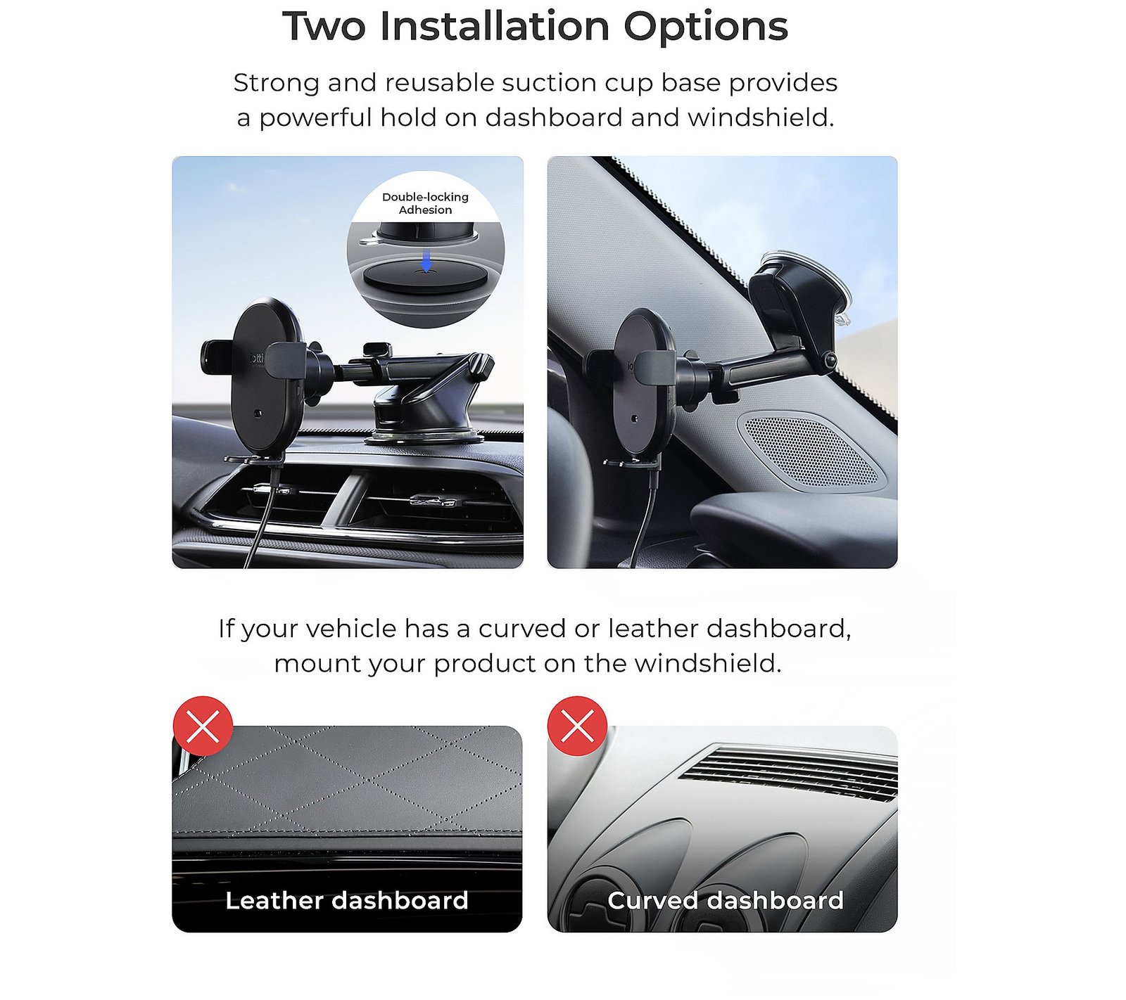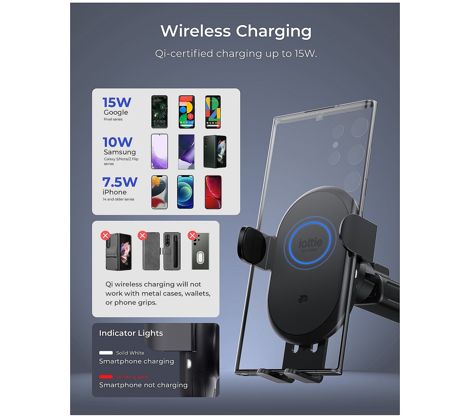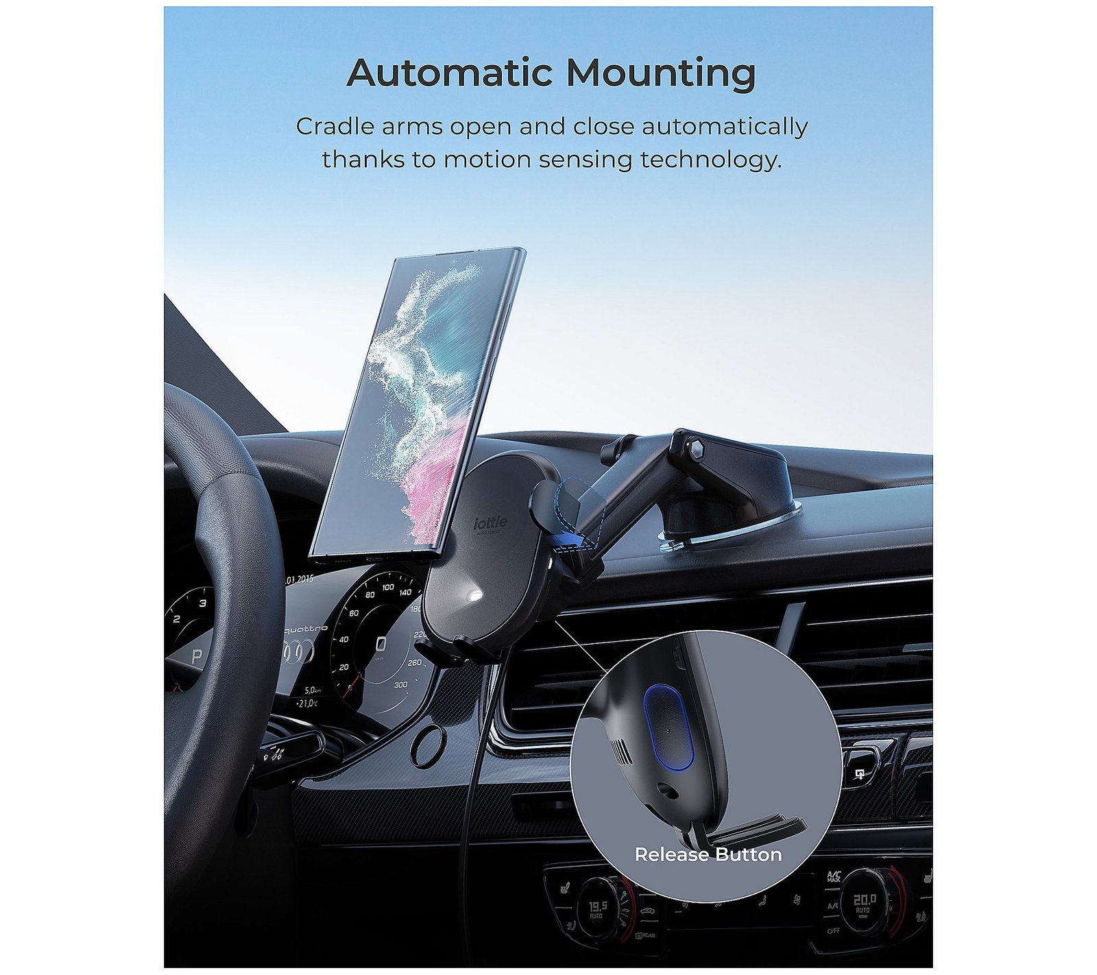 Maps. Music. More power. The iOttie Auto Sense 2 dash and windshield mount is a wireless charging car mount designed for maximum convenience on the road. Simply place your phone near the mount cradle to engage the silent servo motor and the arms will automatically open and close to secure the device. Qi wireless charging technology delivers up to 15W of power without the need for additional charging cables. The mount face rotates, swivels, and tilts, so you can find the perfect viewing angle. And installation is easy thanks to a super-strong suction cup. Keep your eyes on the road while keeping your connections close by. From iOttie. Includes wireless charging cradle, dashboard mounting base, dashboard pad, cable adaptor, and 4’L USB C to C cable Arm automatically opens and closes to secure phone Release buttons on both sides for one-handed removal Reusable suction cup installs on dashboard or windshield Telescopic arm extends from 4.5″ to 6.75″ for flexible reach Rotates 260-degrees for adjustable viewing angles Mount face rotates, swivels, and tilts for customized angle Leaves no residue after removal Imported Set a Reminder Save Reminders