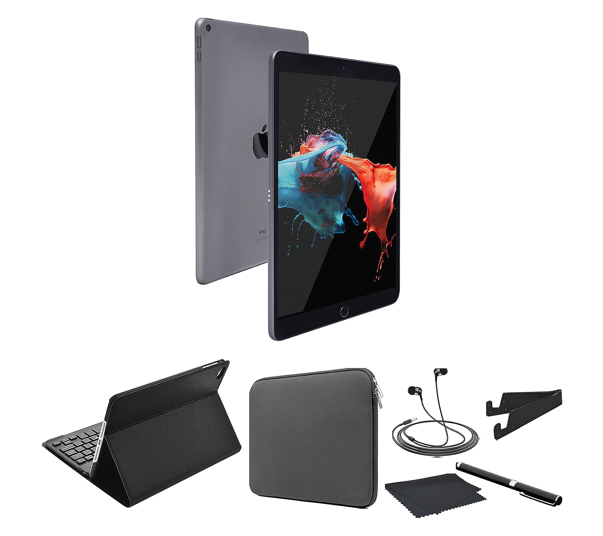 Refurbished: The manufacturer’s inspection process ensures products have been repaired and restored to like-new condition. All parts and accessories that would have been included with the original product are present. Whether you’re catching up on work, looking for entertainment, or connecting with friends, this refurbished 10.2″ diagonal iPad helps make every moment count. Use the brilliant Retina display to stream, create, and explore your favorite apps at home or on the go. Must-have accessories? They’re already included! This bundle gives you a Bluetooth keyboard case, carrying case, tablet stand, stylus, and more. Includes refurbished late 2019 iPad (7th generation), Lightning to USB cable, and USB power adapter; carry case, Bluetooth keyboard case, tablet stand, wired earbuds, cleaning cloth, and stylus pen iPadOS operating system A10 Fusion chip with 64-bit architecture and embedded M10 coprocessor 10.2″ diagonal LED-backlit Retina Multi-Touch display with IPS technology, 2160×1620 resolution 32GB internal storage Wi-Fi 802.11a/b/g/n/ac; dual band (2.4GHz and 5GHz); MIMO Bluetooth 4.2 wireless technology Stereo speakers 8MP rear camera, 1.2MP FaceTime HD front camera Dual microphones Touch ID sensor Supports Apple Pencil (1st generation), not included 3.5mm headphone jack Lightning connector Smart Connector Measures 9.8″H x 6.8″W x 0.29″D; weighs 1.07 lbs Imported Set a Reminder Save Reminders