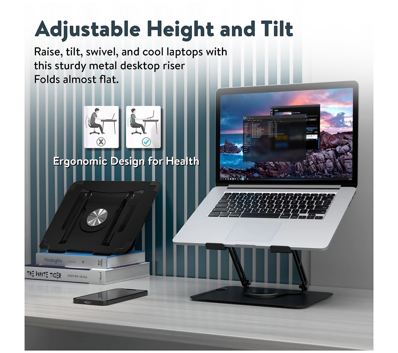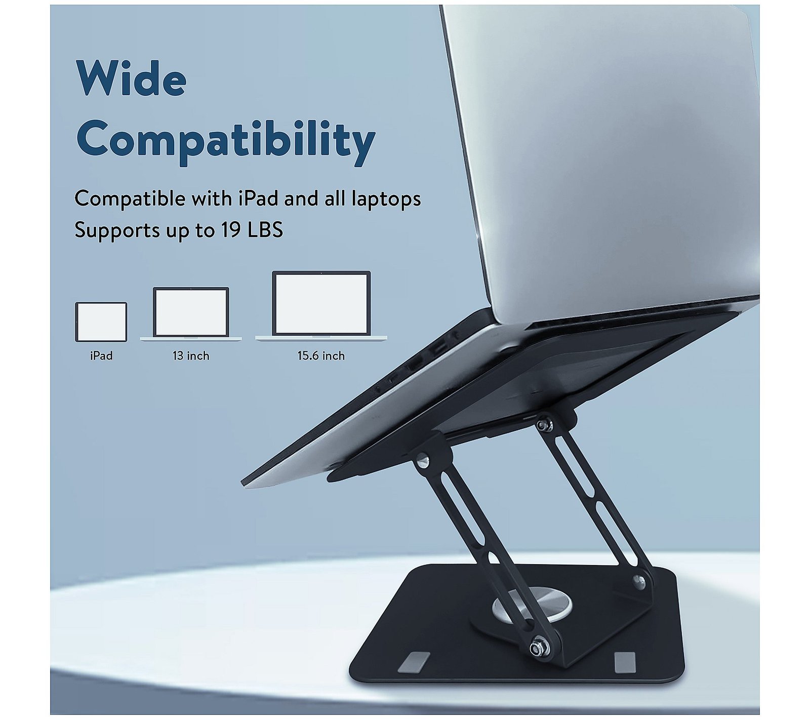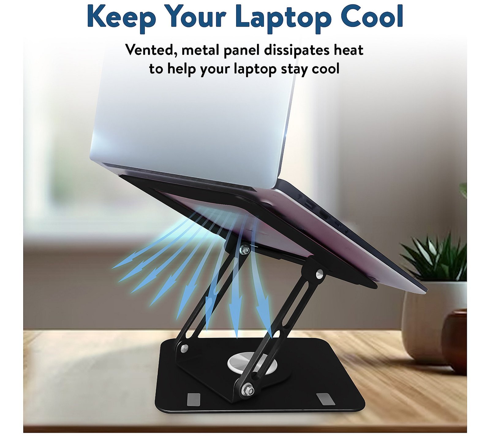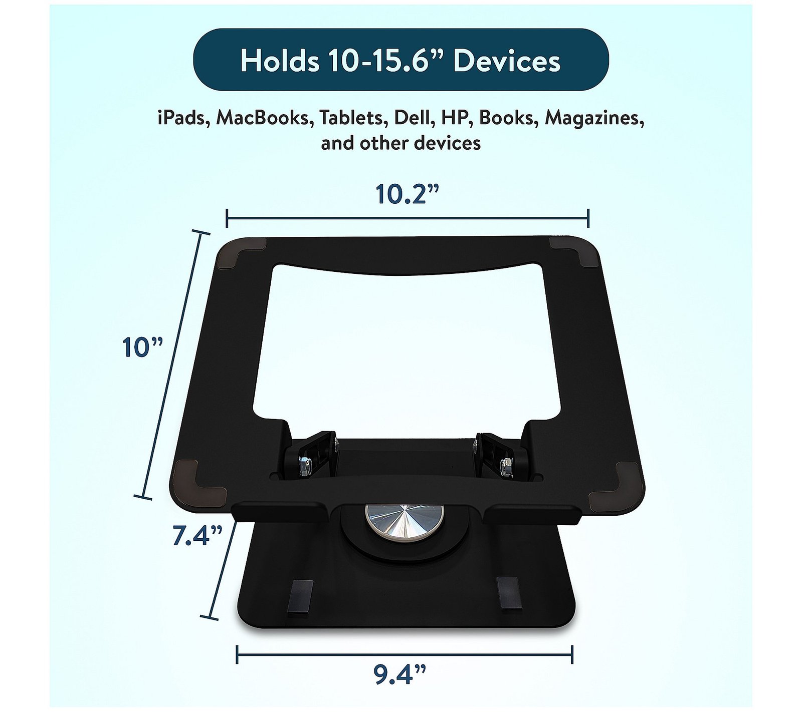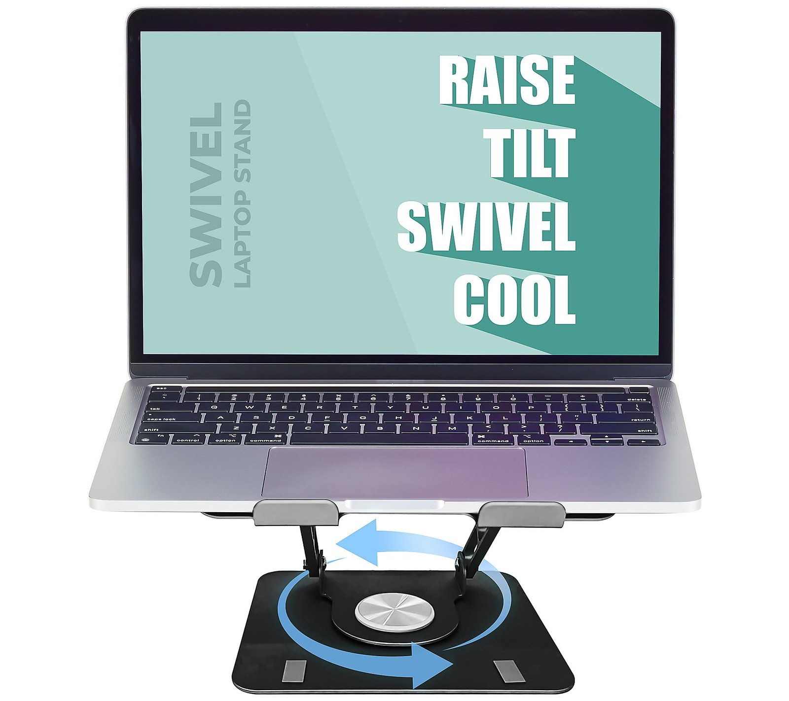 Compute more comfortably with this adjustable swivel laptop stand. Easily raise or tilt to accommodate your seated or standing position, or rotate your screen to share with others. The stand’s vented panel helps keep your computer cool. From Uncaged Ergonomics. Raises laptop up to 7.5″ Tilts to 90-degree angle 360-degree rotation at base Vented panel to help dissipate heat Folds flat for storage Compatible with iPads and laptops up to 17″ Measures approximately 10.2″ x 10″ Imported Set a Reminder Save Reminders